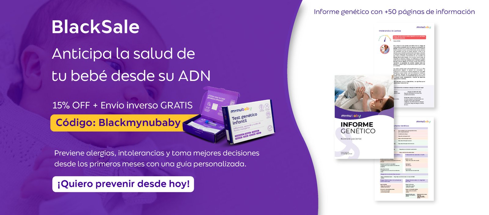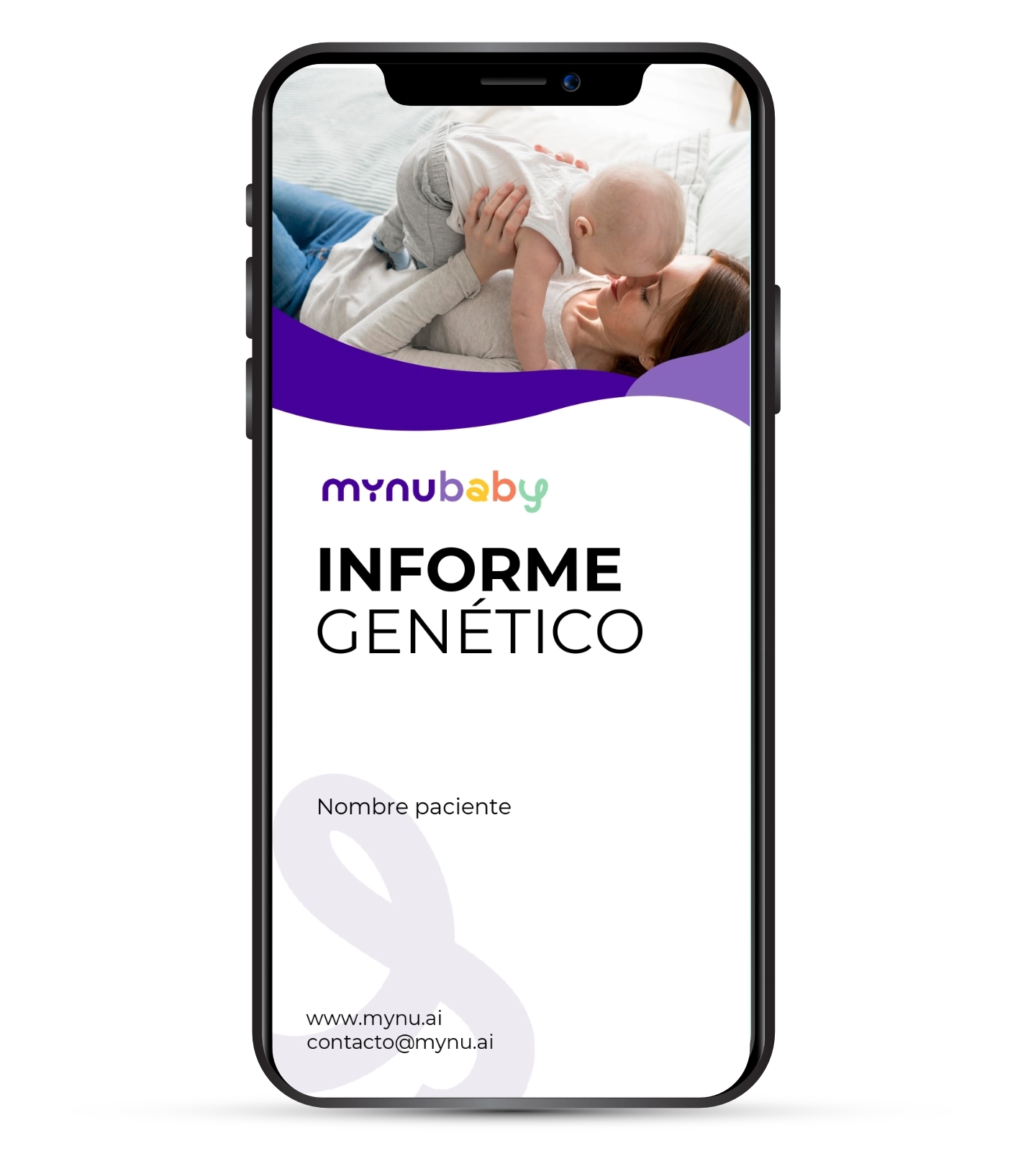 Recibe tu informe genético digital con los riesgos de tu bebé a las distintas categorías y las recomendaciones personalizadas, simples y accionables, para cuidarlo/a desde los primeros días.