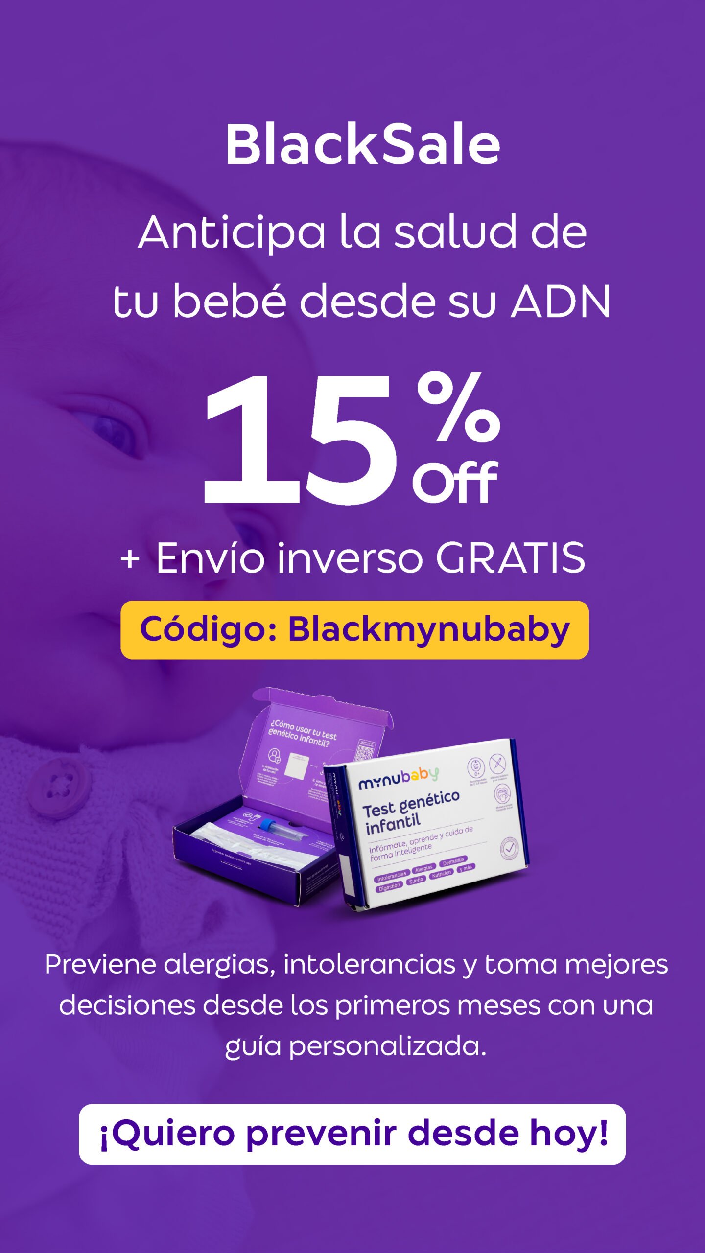 Nuestro test genético infantil te permite descubrir información valiosa sobre tu hijo/a, de manera segura, rápida y confiable. Te entrega una guía de recomendaciones personalizada y práctica para guiar los cuidados del bebé desde el nacimiento. Todo con un método indoloro y no invasivo, usando un simple hisopado bucal. Este test no constituye ni reemplaza un diagnóstico clínico.